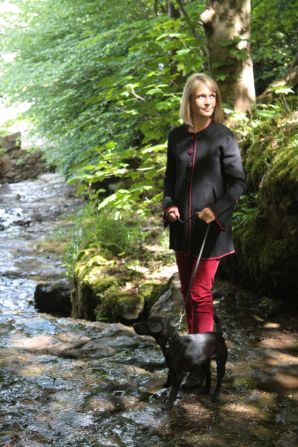 We love this high waisted, long slender jacket. With pleats to both the front and back and the added detail of pleated sleeves.